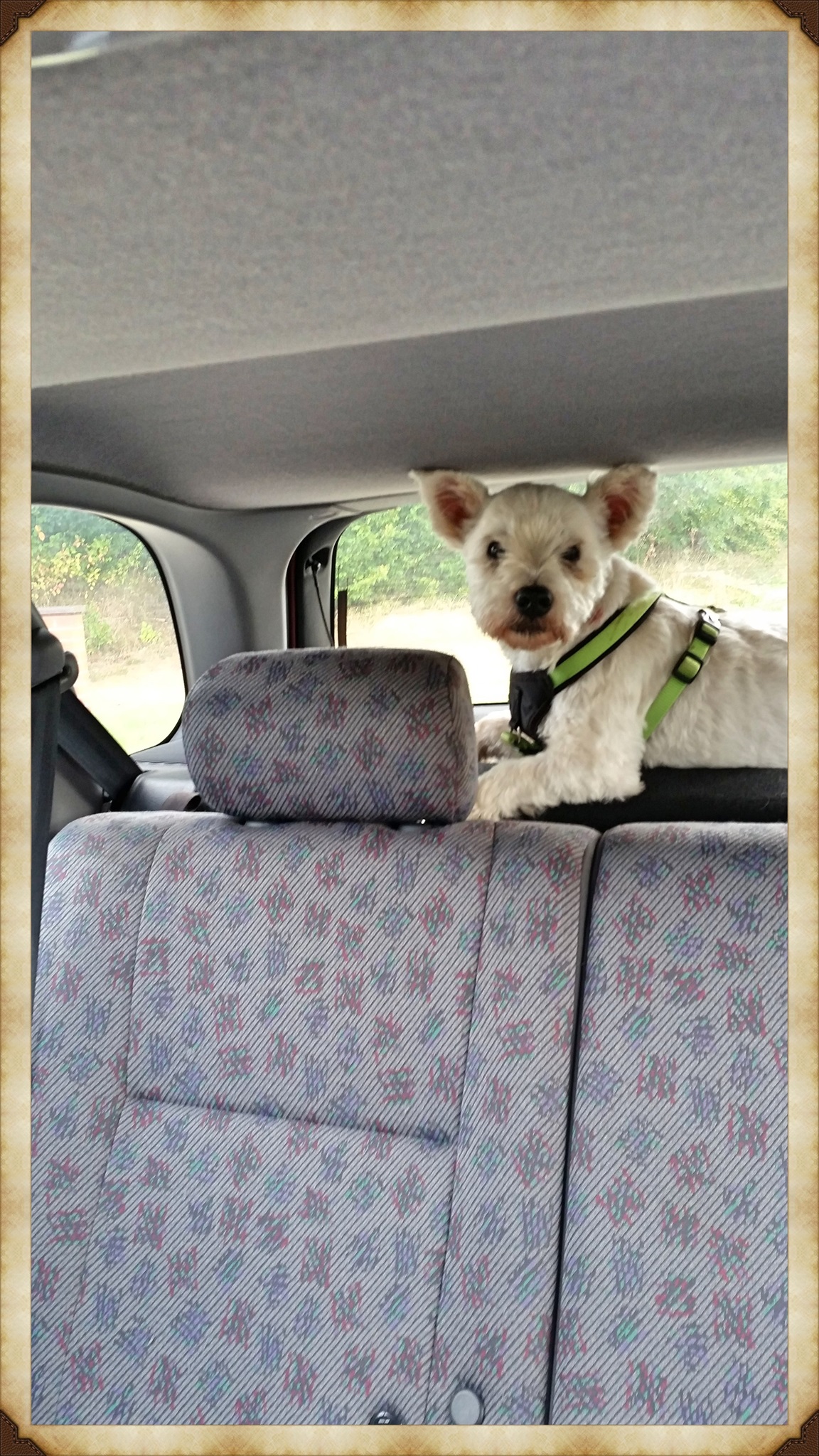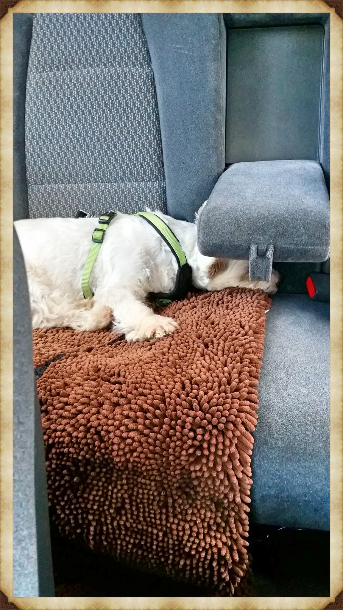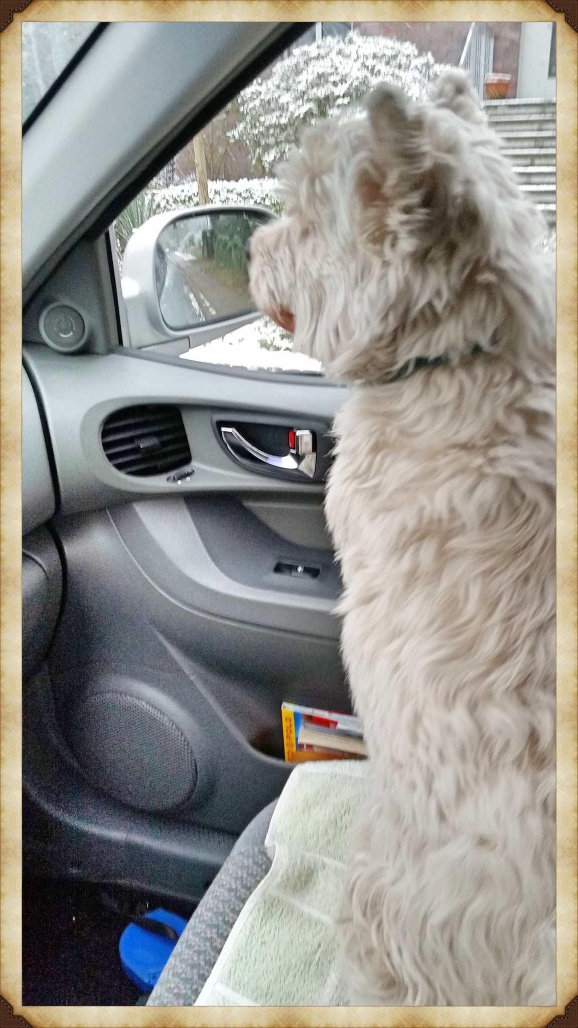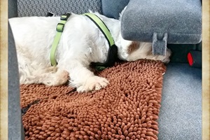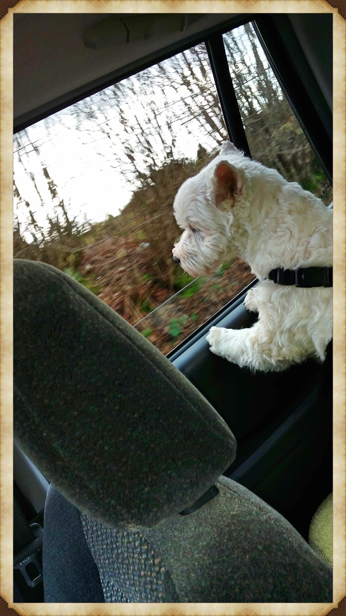 Wenn Herrchen bei langsamer Fahrt hinten das Fenster runter fährt, kann ich, stets angeleint natürlich, bequem aus dem Fenster schauen. Dazu hat Herrchen noch die Armlehne mit Teppich bezogen, so kann ich nicht abrutschen und bequem ist es zudem auch.