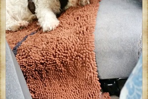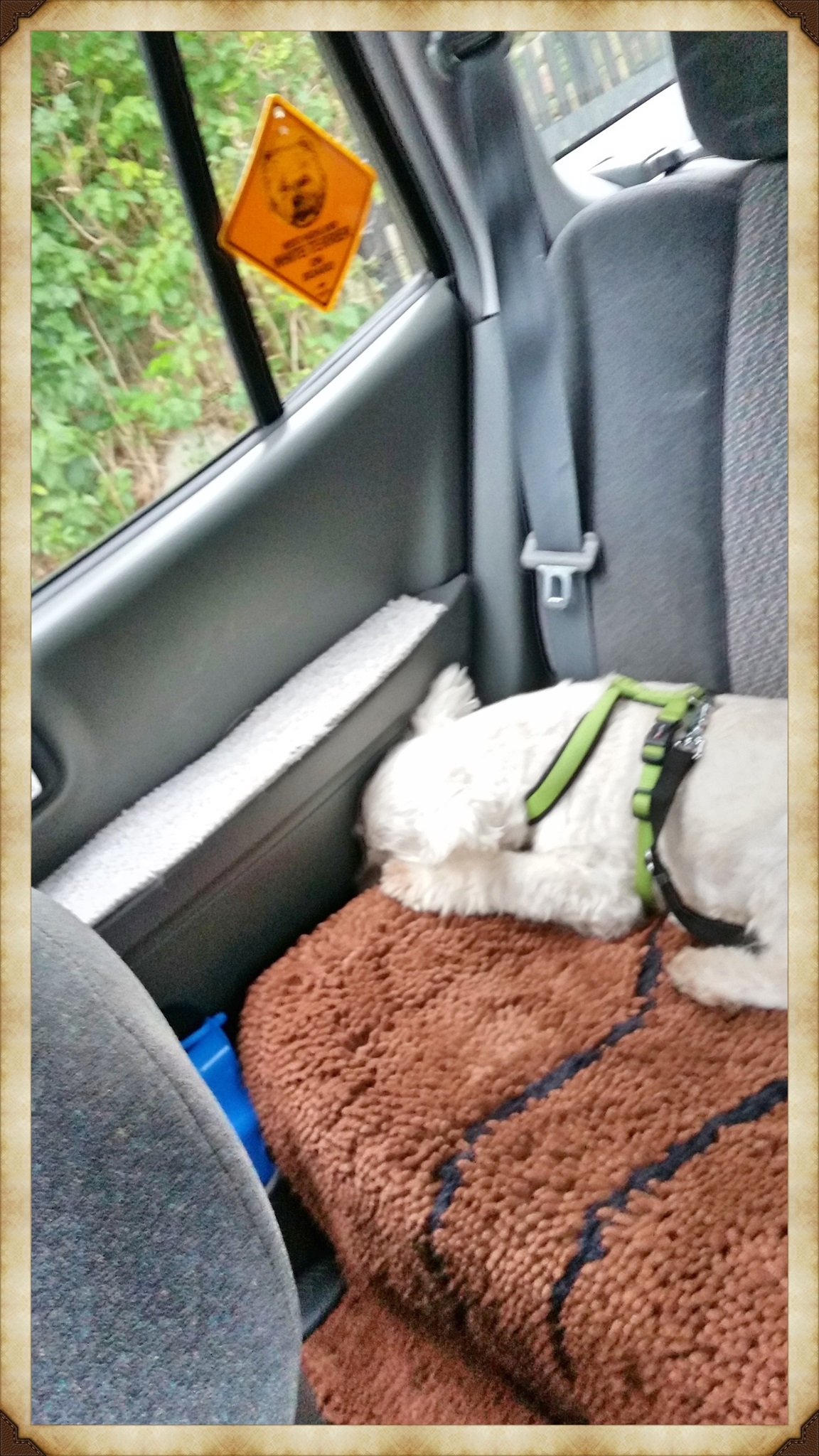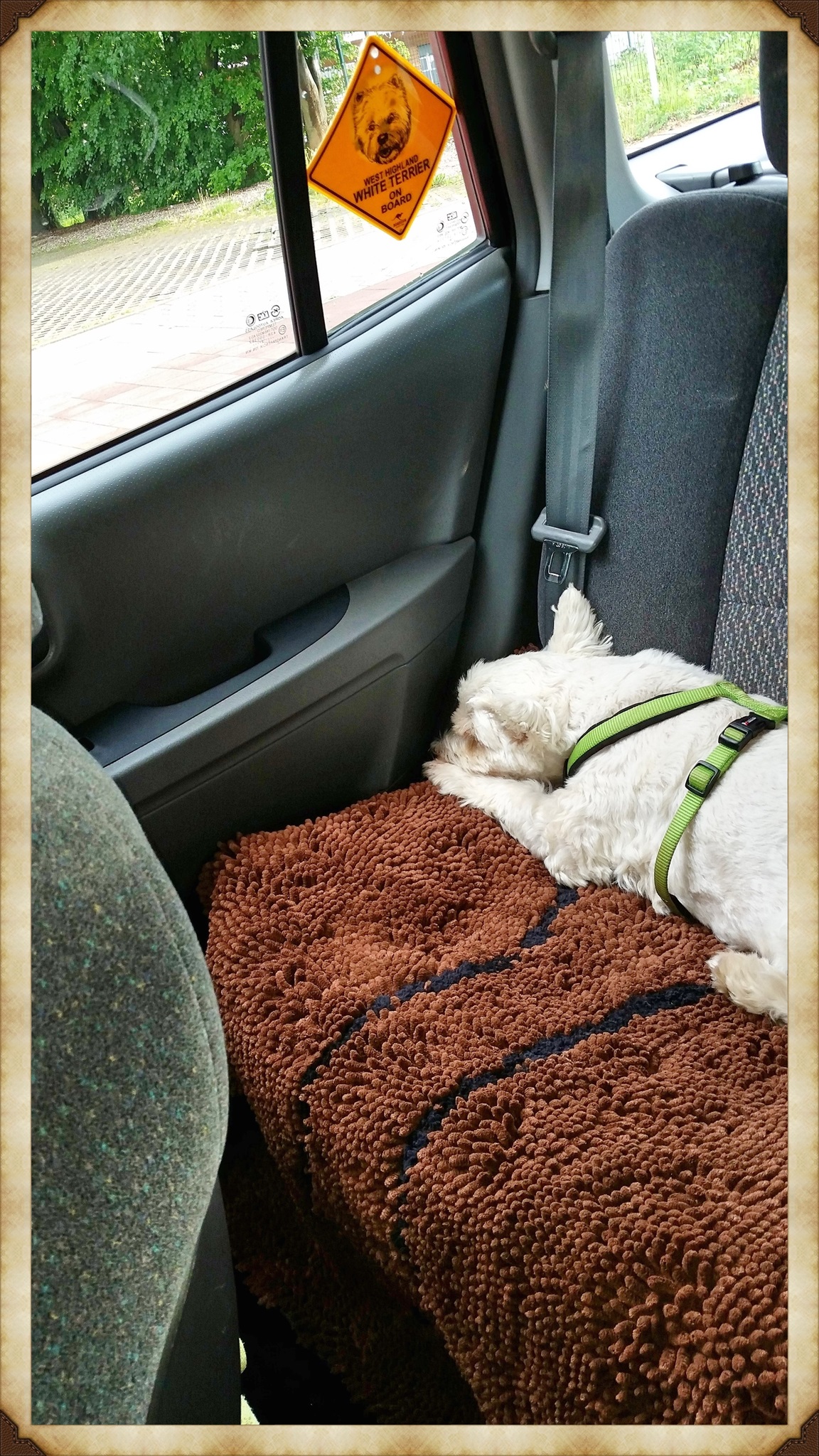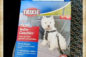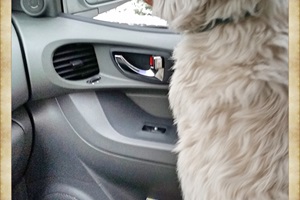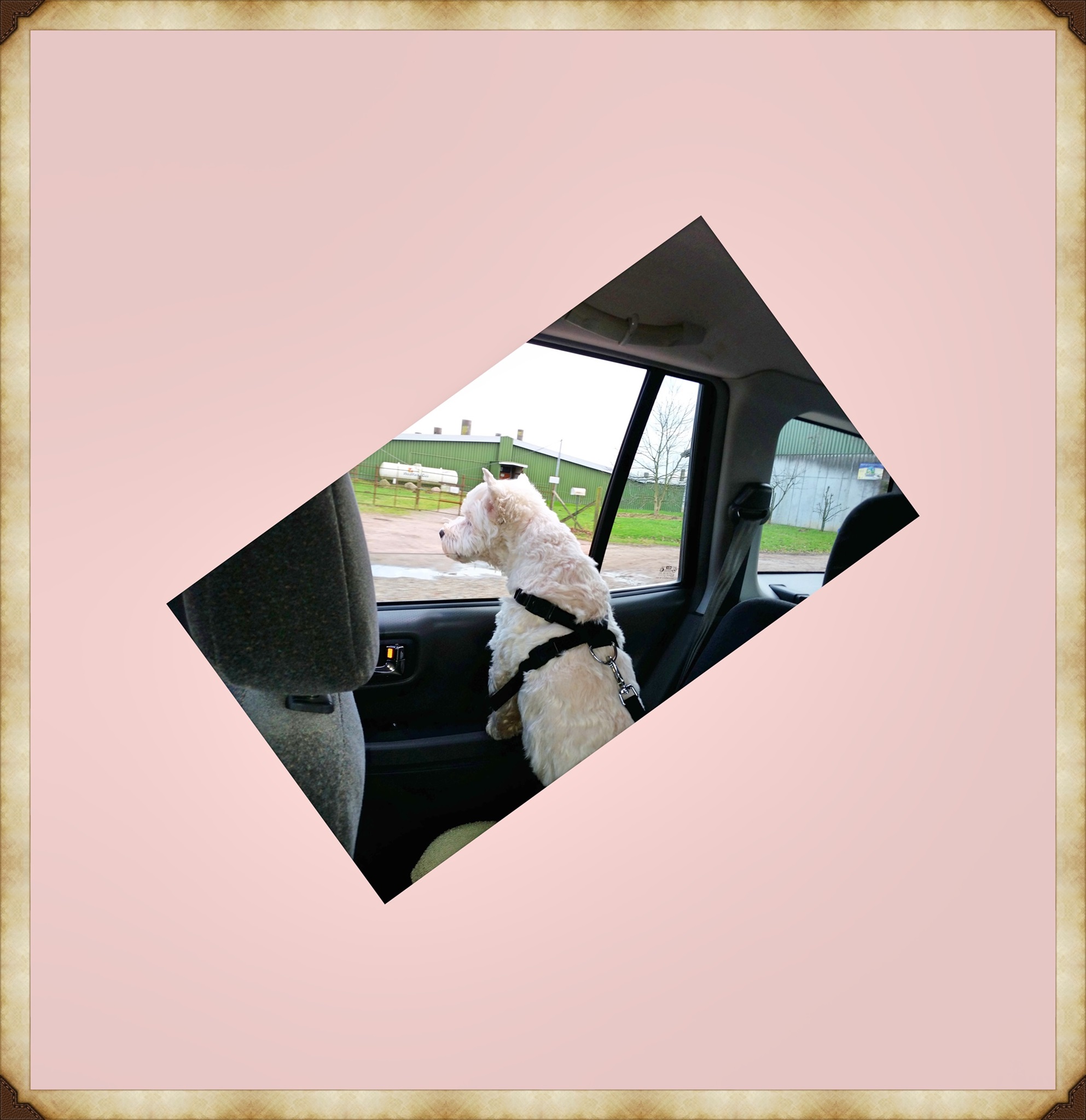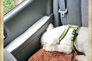 Wenn Herrchen bei langsamer Fahrt hinten das Fenster runter fährt, kann ich, stets angeleint natürlich, bequem aus dem Fenster schauen. Dazu hat Herrchen noch die Armlehne mit Teppich bezogen, so kann ich nicht abrutschen und bequem ist es zudem auch.
