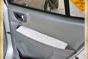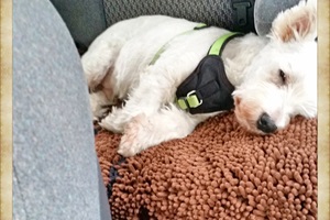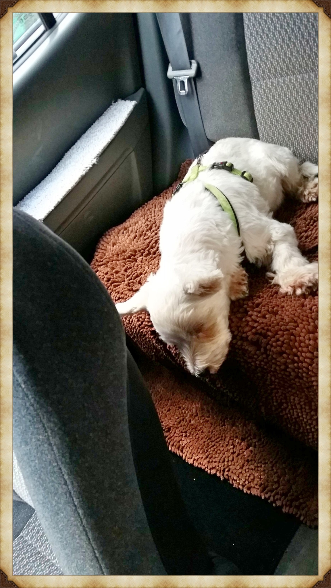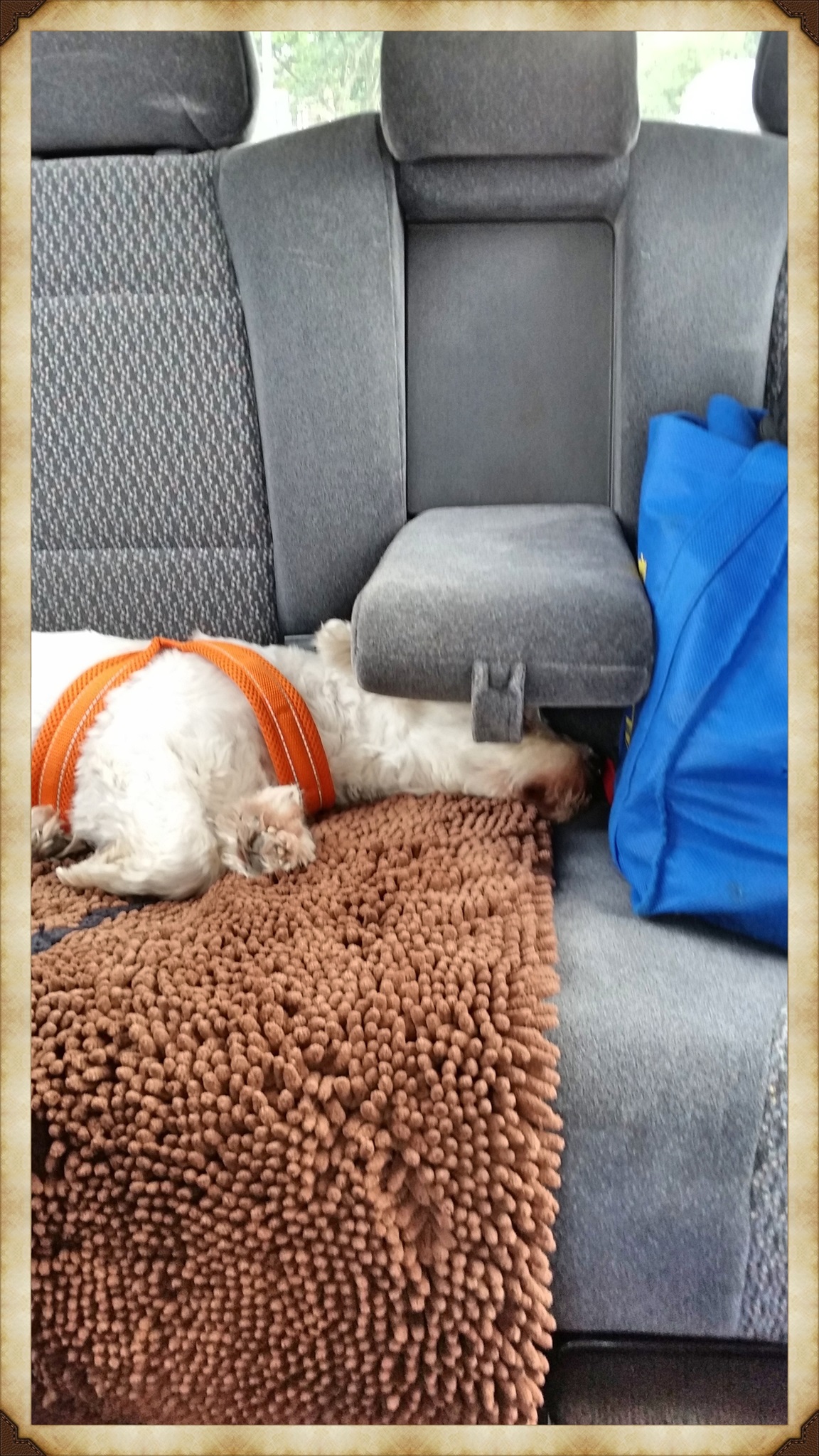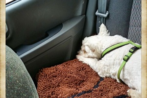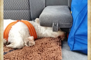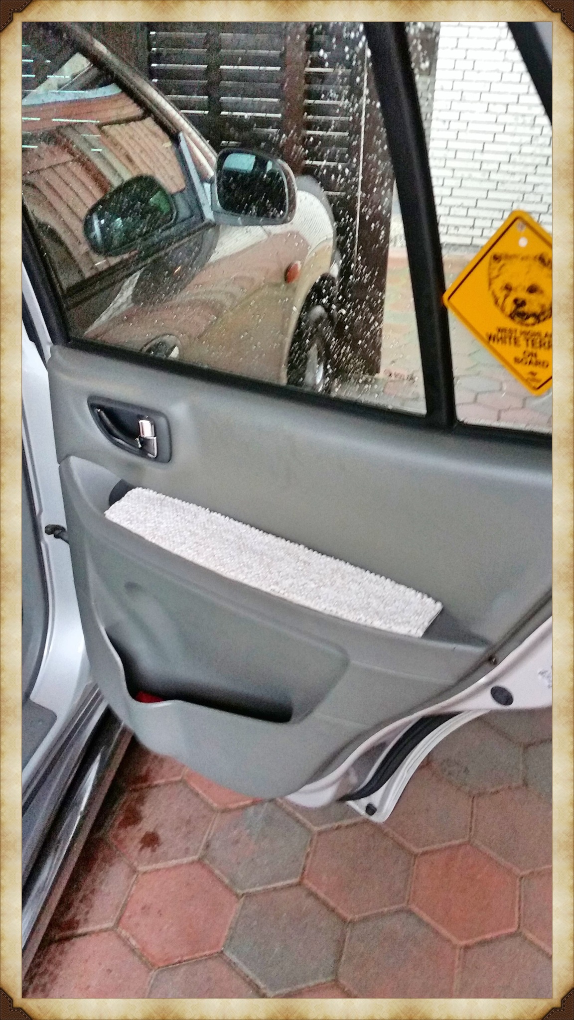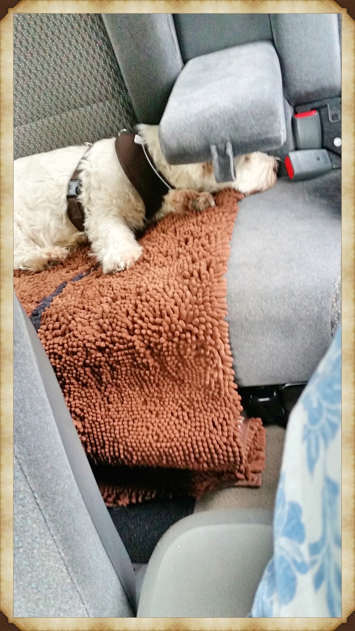 Wenn Herrchen bei langsamer Fahrt hinten das Fenster runter fährt, kann ich, stets angeleint natürlich, bequem aus dem Fenster schauen. Dazu hat Herrchen noch die Armlehne mit Teppich bezogen, so kann ich nicht abrutschen und bequem ist es zudem auch.